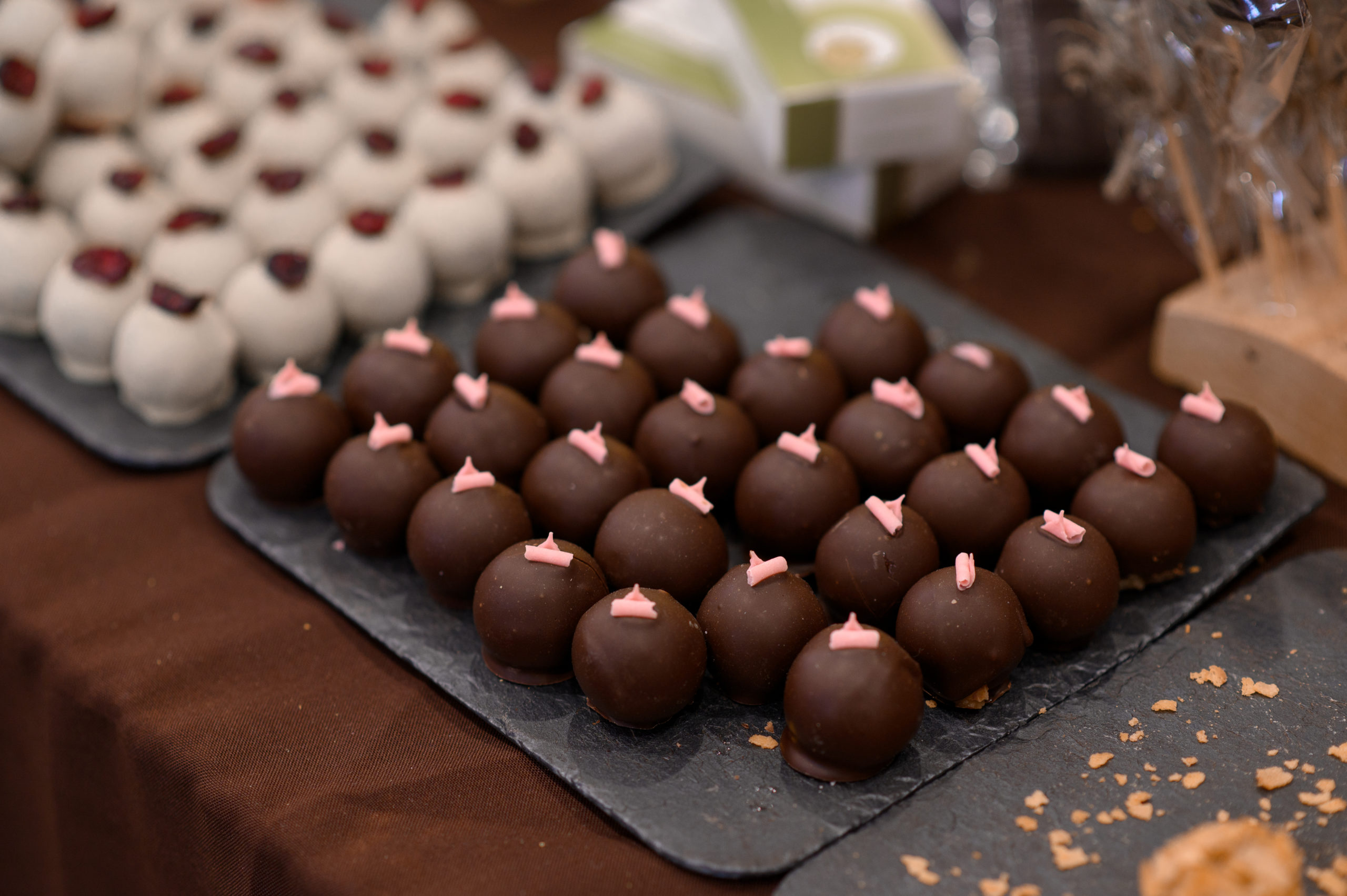 A set of dark chocolate candies for sale.